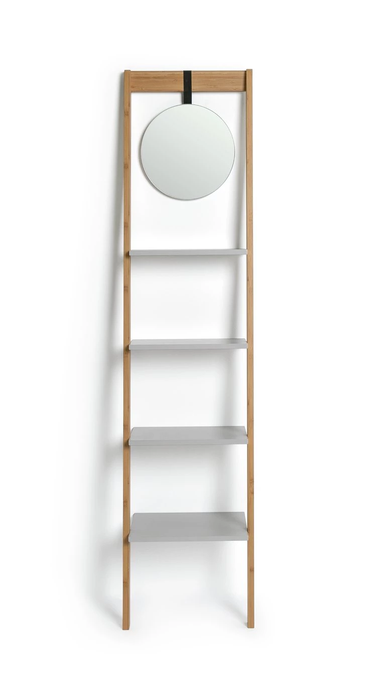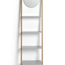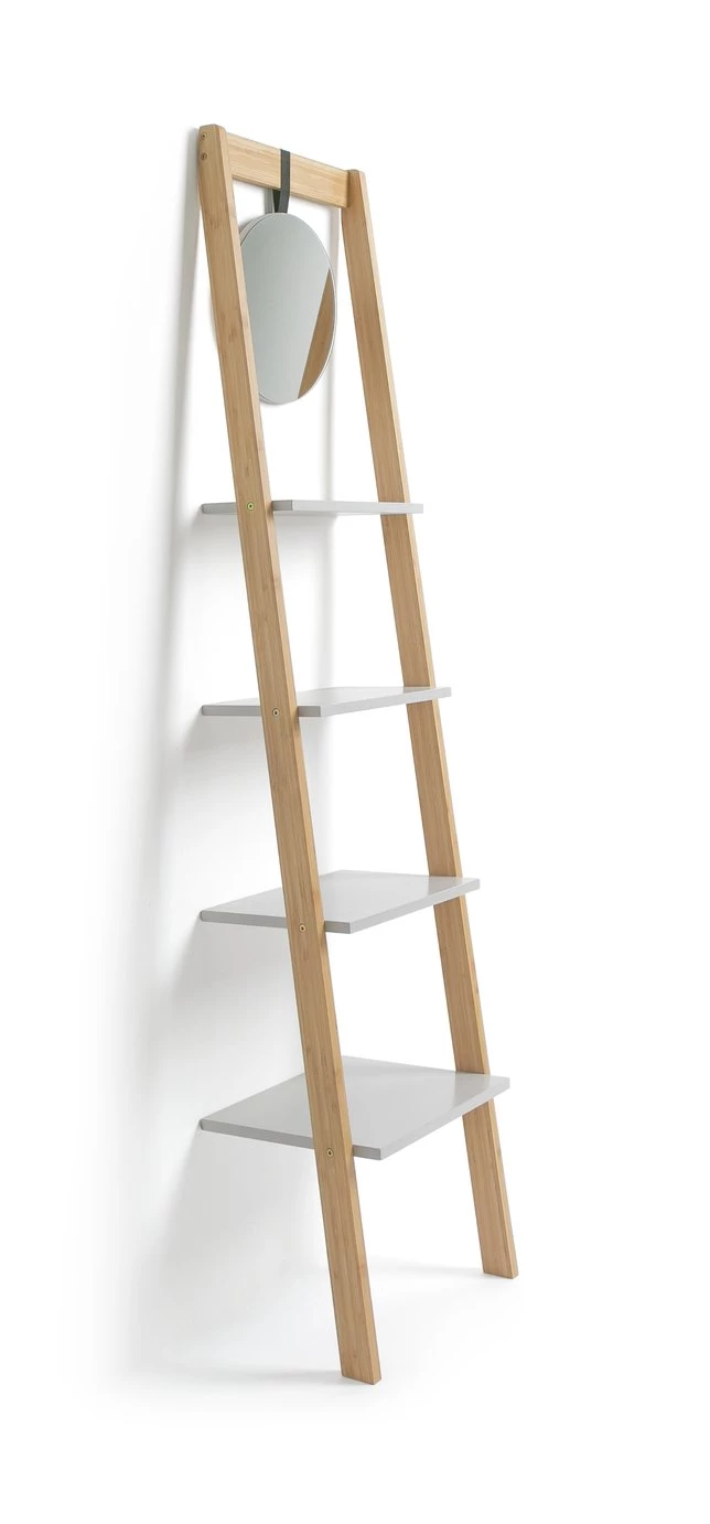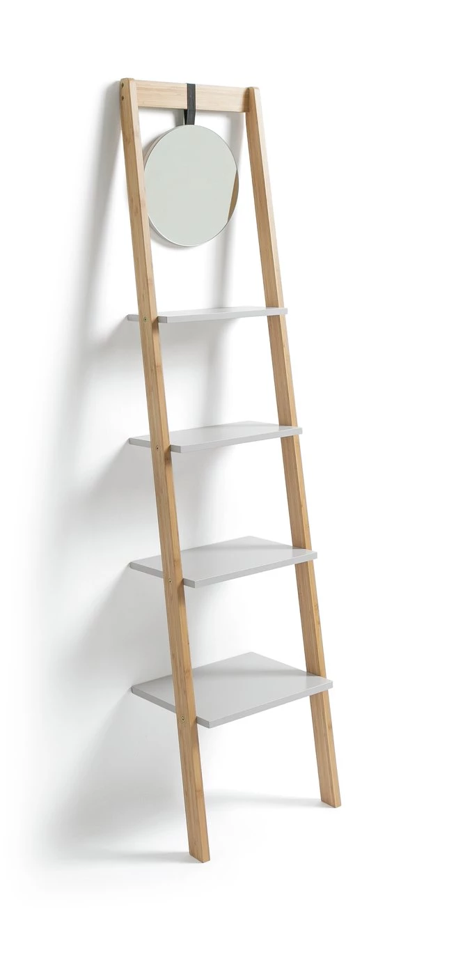 Step up your bathroom storage. This cool, ladder shelf unit is a super space saver. Lots of storage in a slim profile piece topped with a handy disc mirror. Made from bamboo and MDF in an oak effect finish. It's contemporary design that's eco-friendly too. 4 spacious white shelves provide plenty of room for your bathroom bits and bobs. Easy to assemble with all fittings provided. Compact clutter control. We love it.