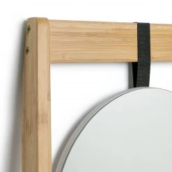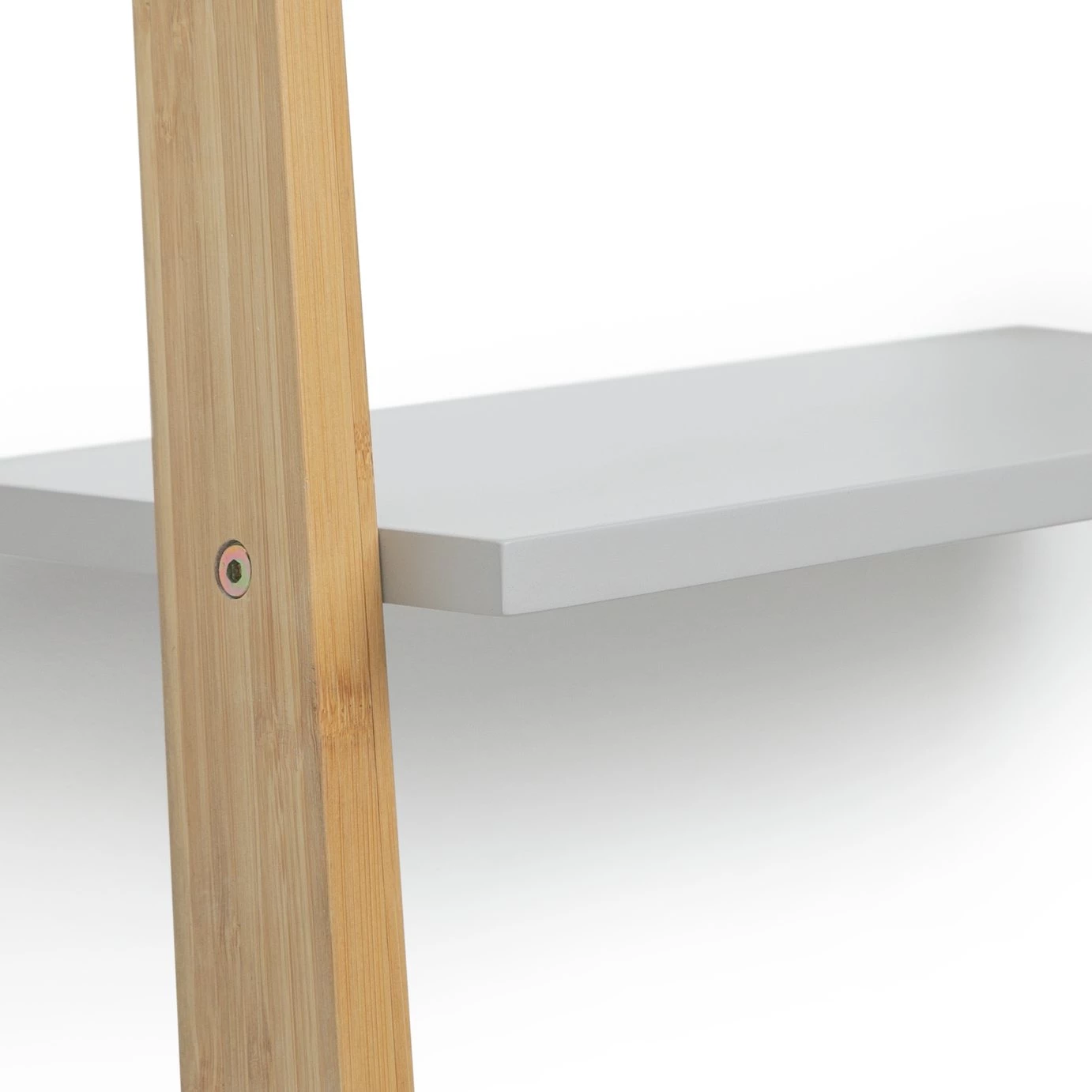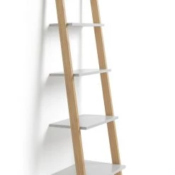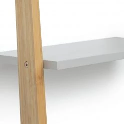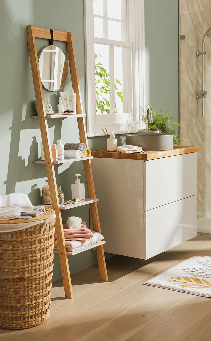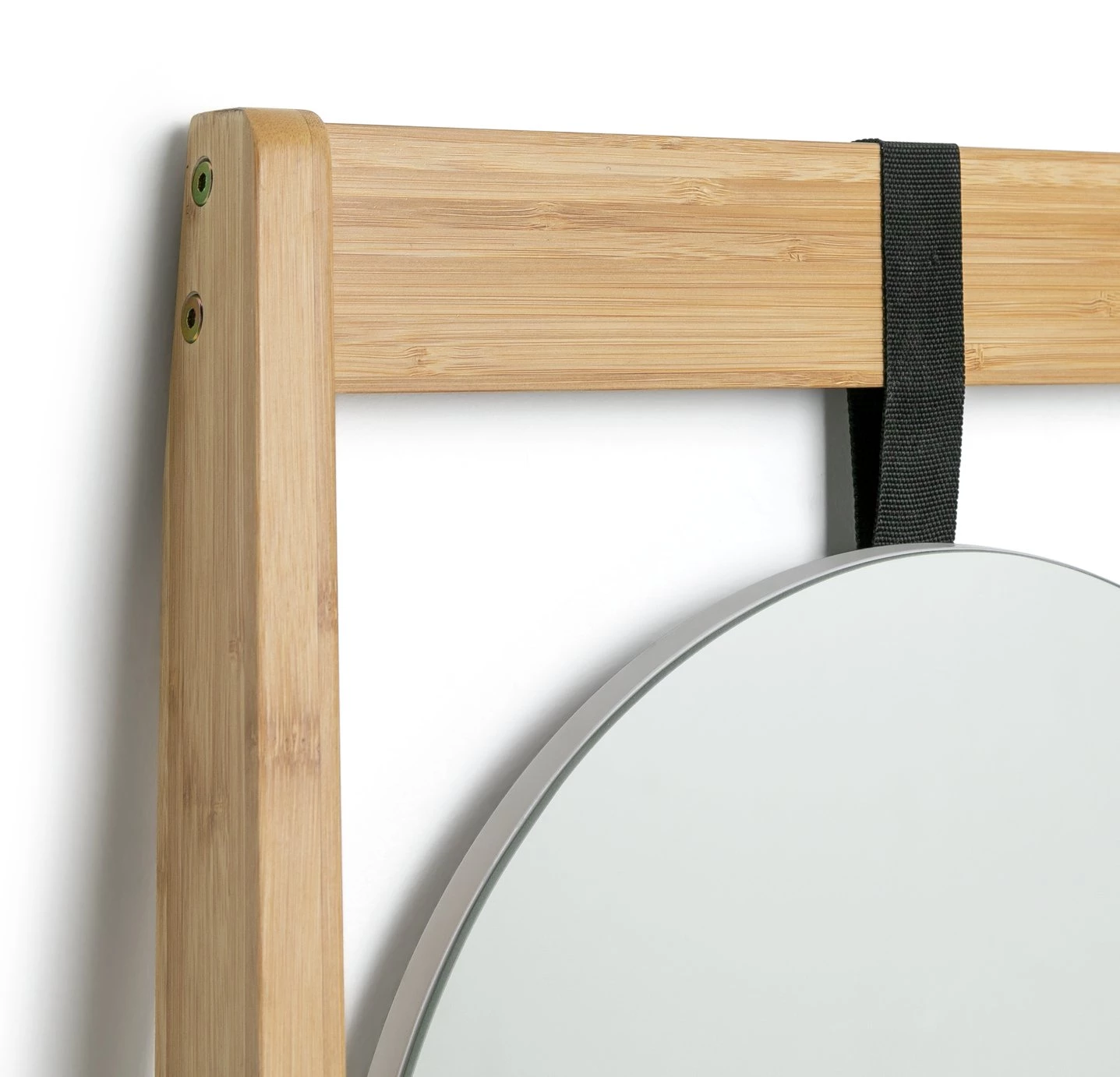 Step up your bathroom storage. This cool, ladder shelf unit is a super space saver. Lots of storage in a slim profile piece topped with a handy disc mirror. Made from bamboo and MDF in an oak effect finish. It's contemporary design that's eco-friendly too. 4 spacious white shelves provide plenty of room for your bathroom bits and bobs. Easy to assemble with all fittings provided. Compact clutter control. We love it.