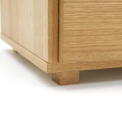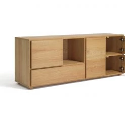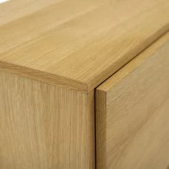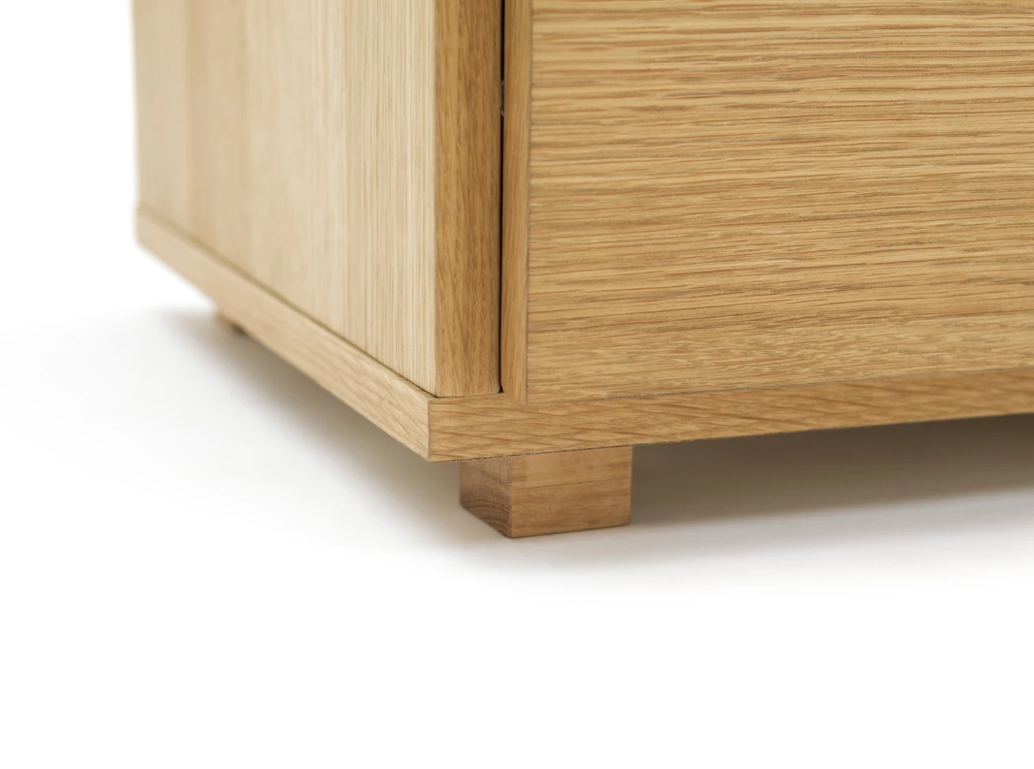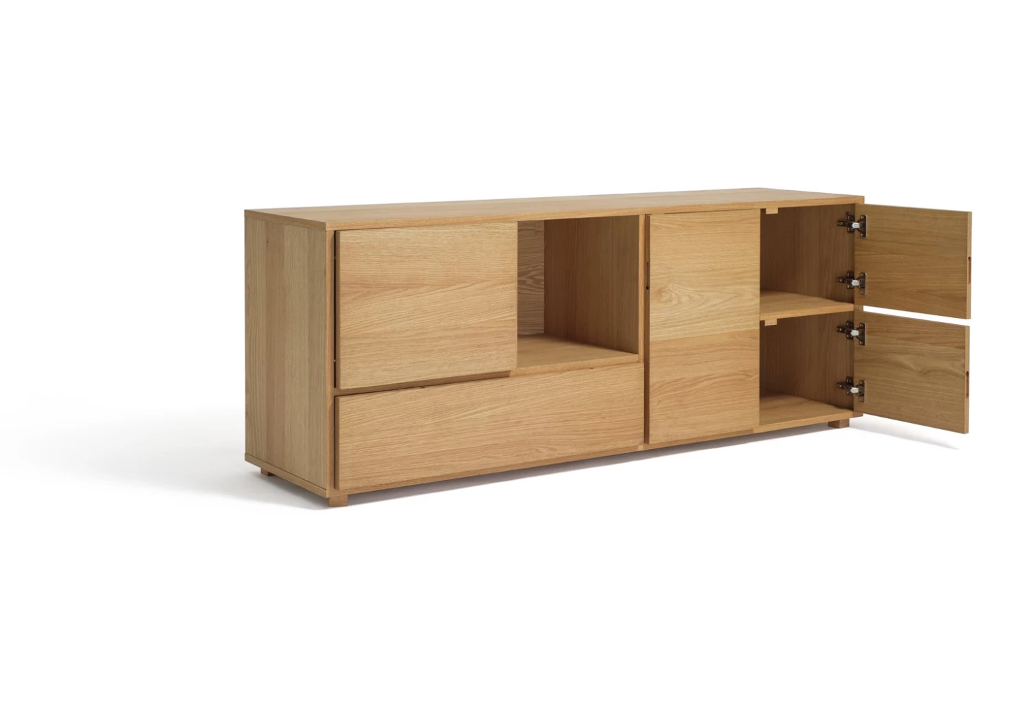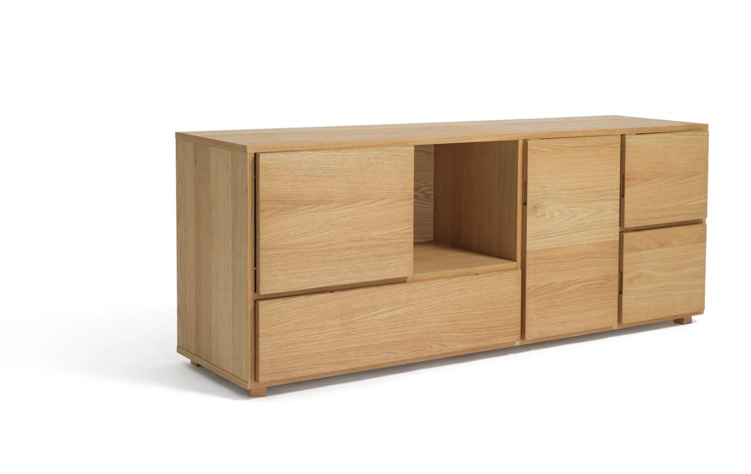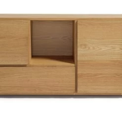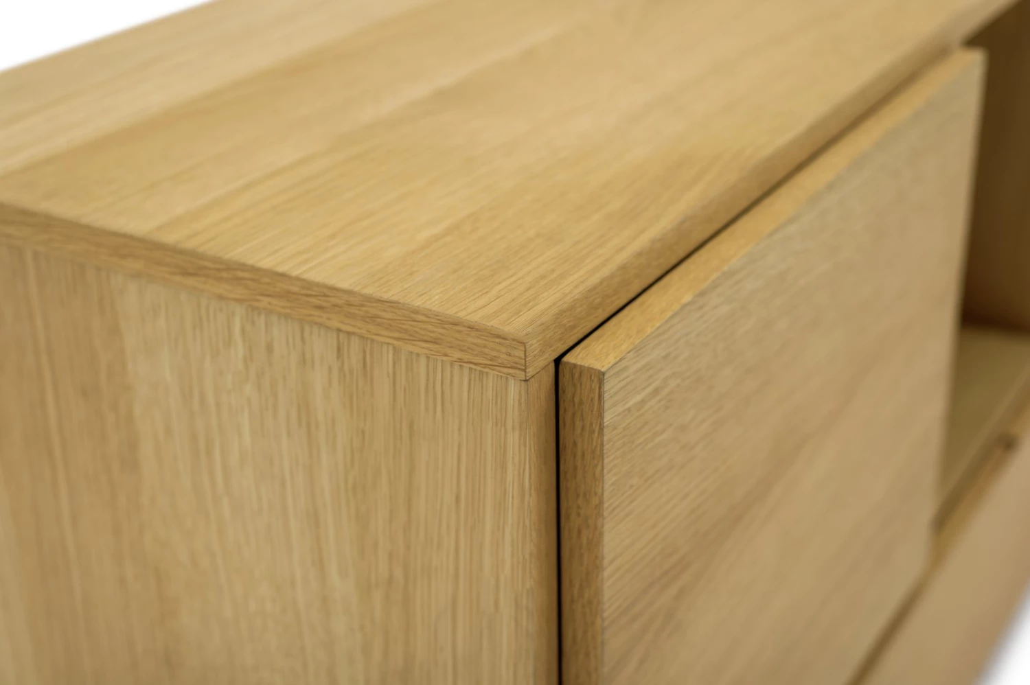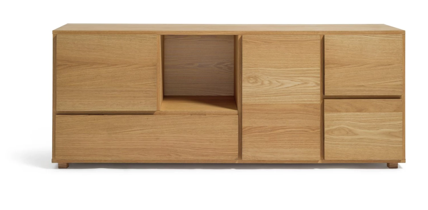 Calming, contemporary and cool! The simplicity of this natural looking block sideboard is so satisfying. Neutral to suit most decors with push to open doors for a flush, handle free look. Amazing storage space too. We count four cupboards, a gliding drawer and a shelf. Plays the role of the drinks' cupboard beautifully. Pop a plant on top and a range of family photos it soon becomes the focal point in the lounge. Store magazines, Box Sets, books and games below. Sorted!