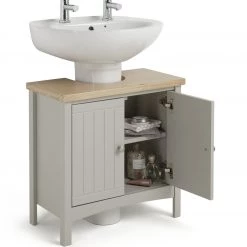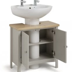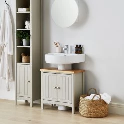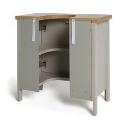 Genius solution. Say hello to easy under sink storage. Make the most of that wasted space. This 2-door storage unit from our Bournemouth collection just slips around an existing pedestal sink to give so much storage. With an adjustable internal shelf to suit your needs, this little guy is ideal for towels, cosmetics or cleaning kit. A great way to bring order to your bathroom. The natural warmth of real wood adds a touch of luxury and a charming two-tone contrast. Instant happiness.