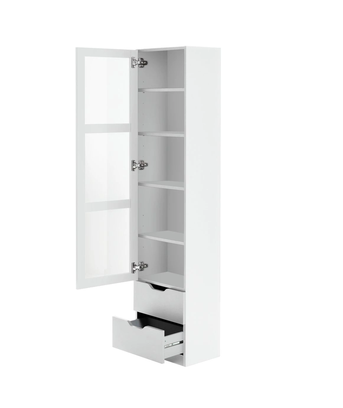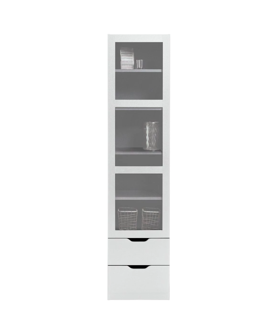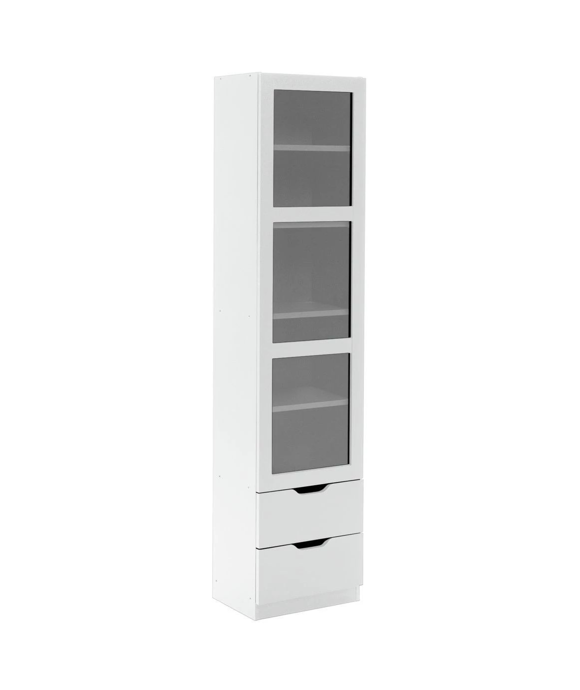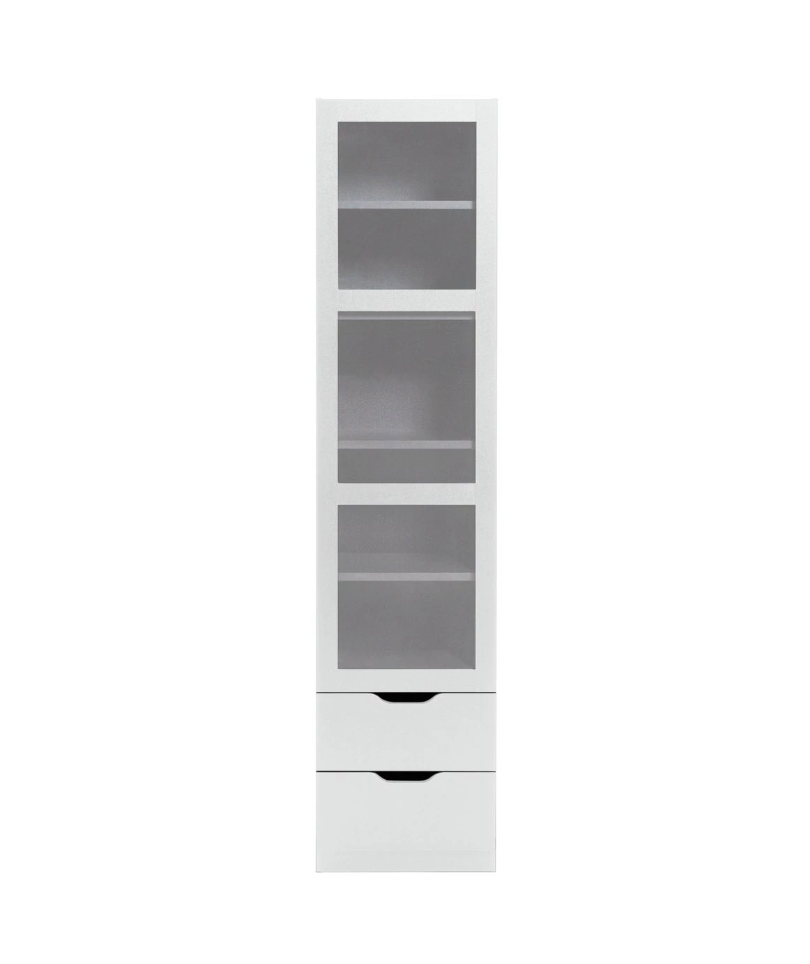 Nice to see you. Show off your books and treasures in this tall display unit, behind the safety of a glass door. The white wood and curved cutout handles bring a modern element to your home decor. Perfect for adding extra storage to a lounge or bathroom, with two drawers for all the extras.