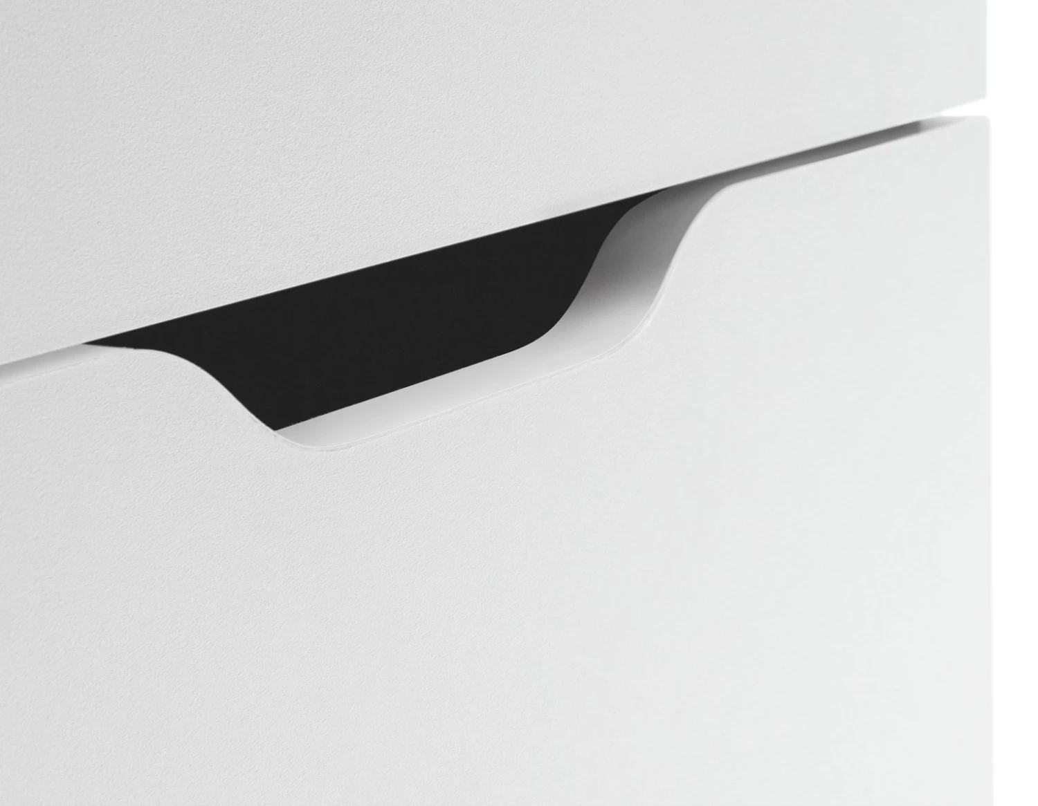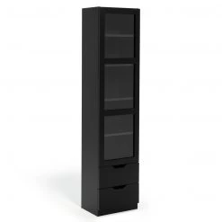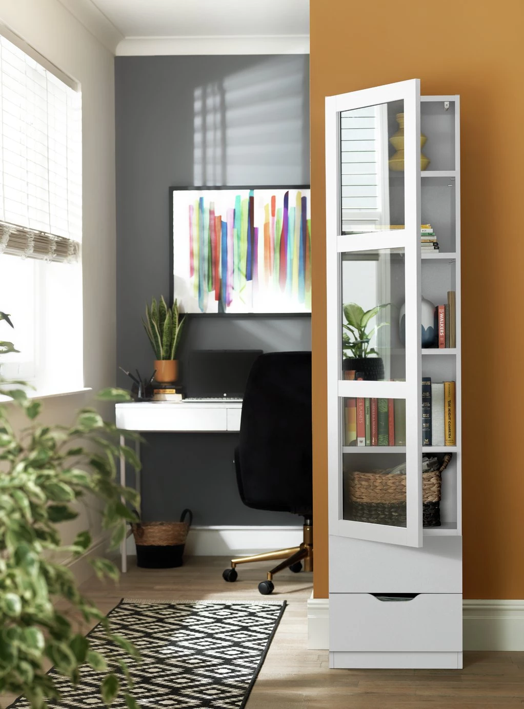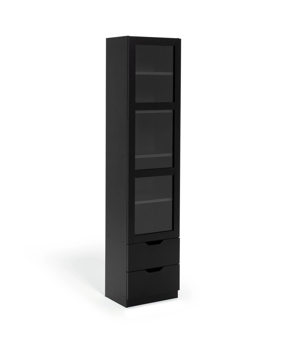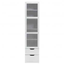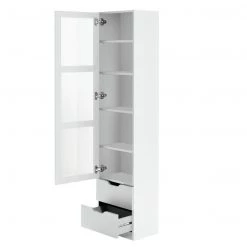 Nice to see you. Show off your books and treasures in this tall display unit, behind the safety of a glass door. The white wood and curved cutout handles bring a modern element to your home decor. Perfect for adding extra storage to a lounge or bathroom, with two drawers for all the extras.