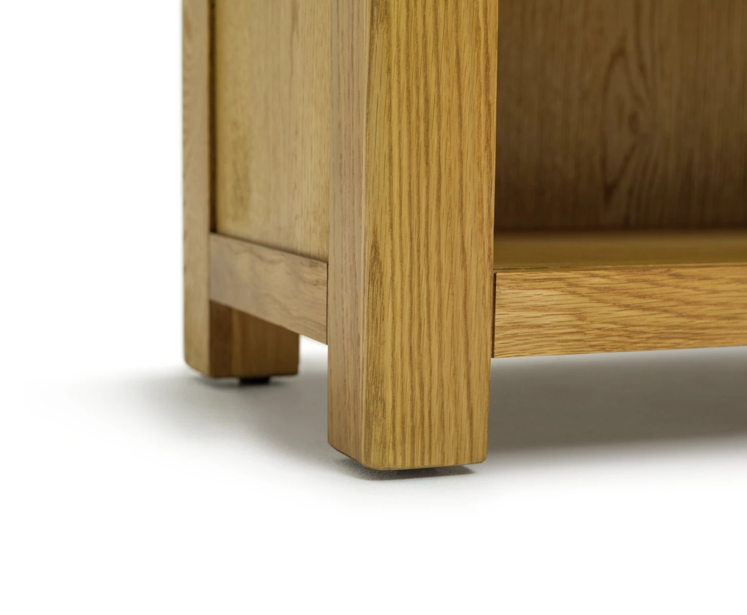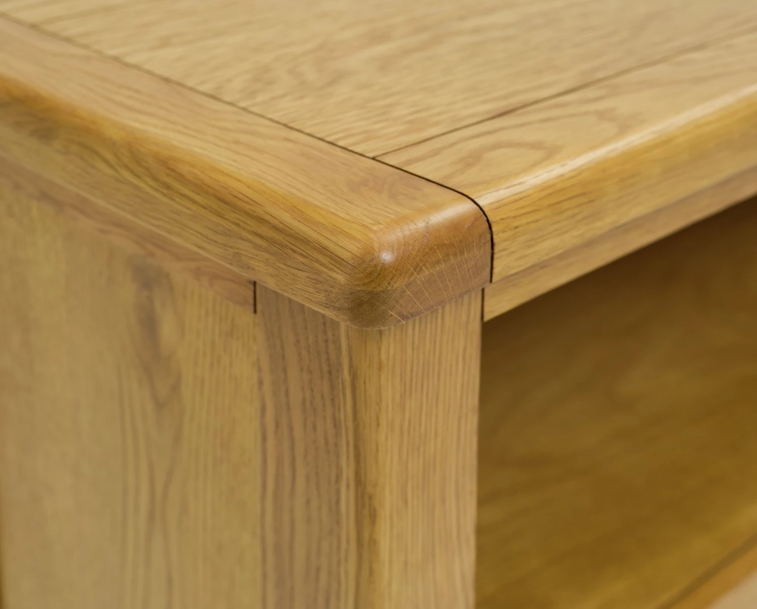Inspired by country living, the Kent collection arrives fully assembled, so you can put your feet up as soon as it arrives! Its chunky look with rounded edges make this a sturdy bookcase, ideal for a busy household. The top surface shows off the natural grains and knots of the wood and the oak finish is warm and inviting, so it's perfect for cosying up a lounge.