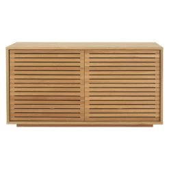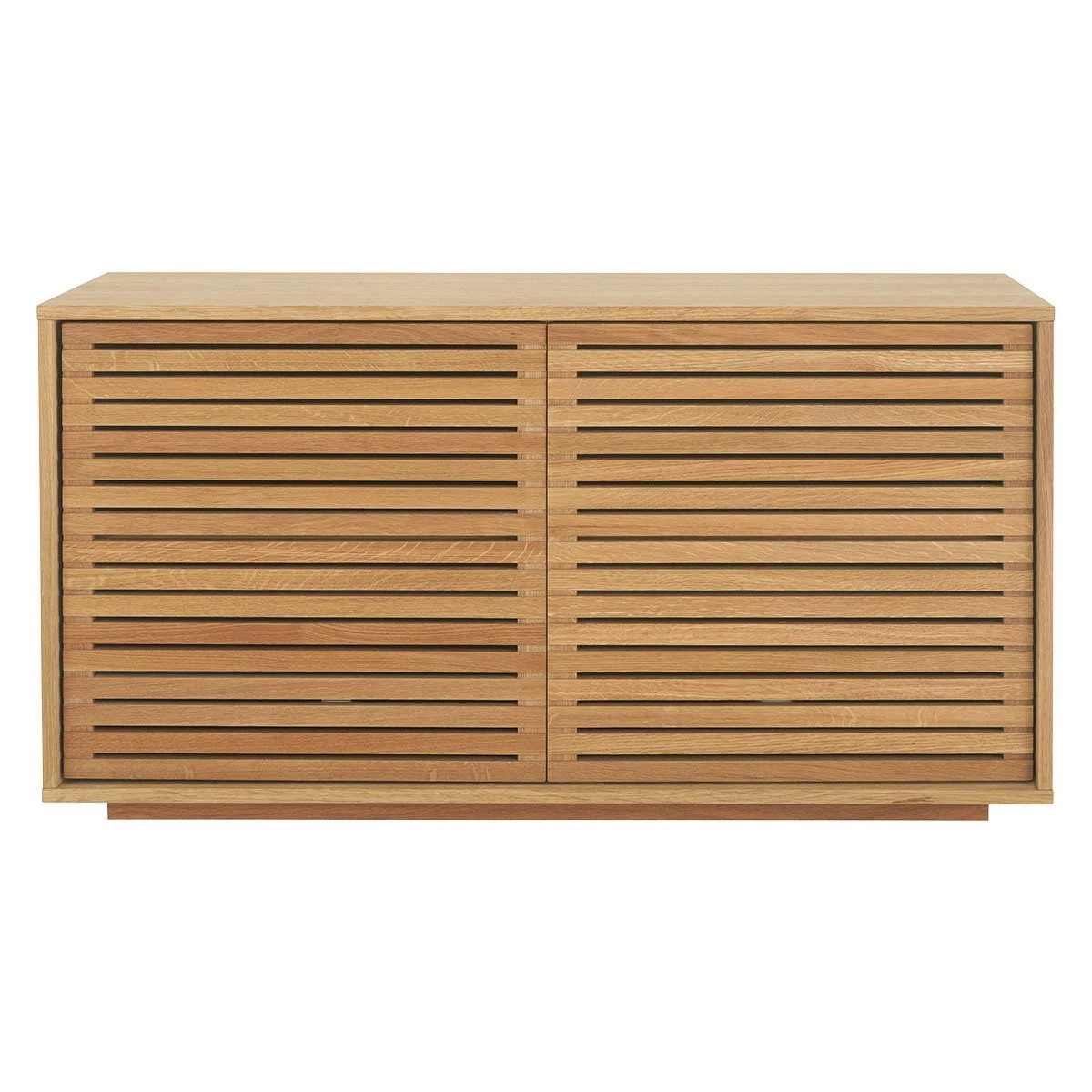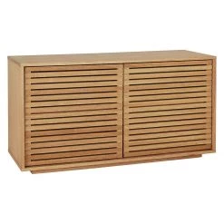 Made from oak and oak veneer, the sideboard has a warm, oiled finish and its combination of slatted doors and hidden plinth give the design a light appearance.