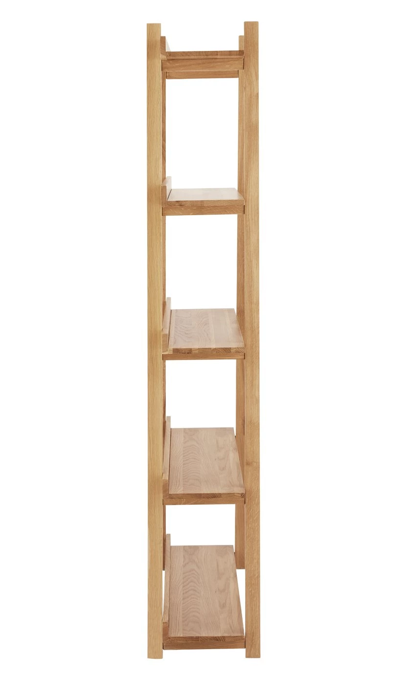 Taking its inspiration from the Far East, the Elspeth solid oak bookcase has a frame that tapers inwards, adding subtle visual interest to a room. The bookcase has a lacquered finish to protect the wood's beautiful grain and offers ample space for books and a showcase for sculptural shapes. Requires home-assembly.