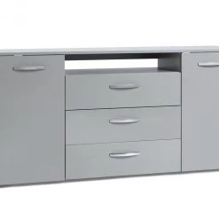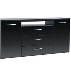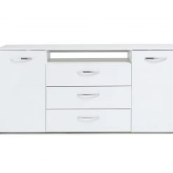 This large sideboard is perfect for contemporary homes. Ideal for use as a TV unit, the open console shelf provides easy cable access around the back for a clean and tidy look. With 3 easy-glide drawers, 2 cupboards and adjustable shelving within, this modern unit gives you plenty of storage to tuck games, DVDs and spare leads out of sight. Finished in a smooth gloss, each drawer and door is finished with a contrasting chrome handle.