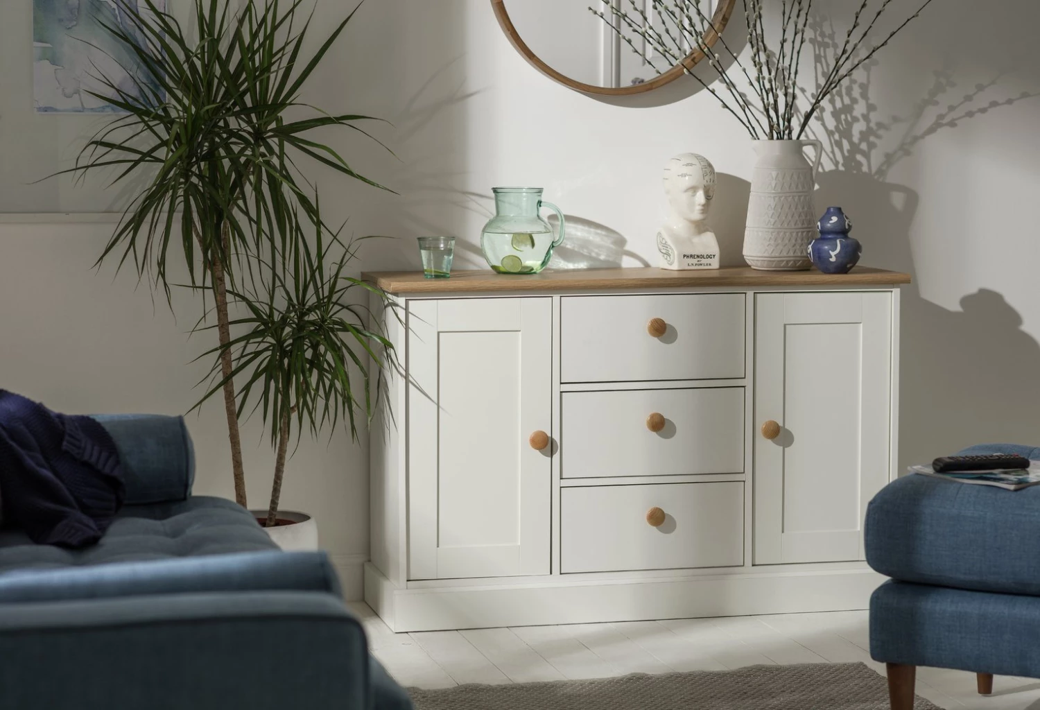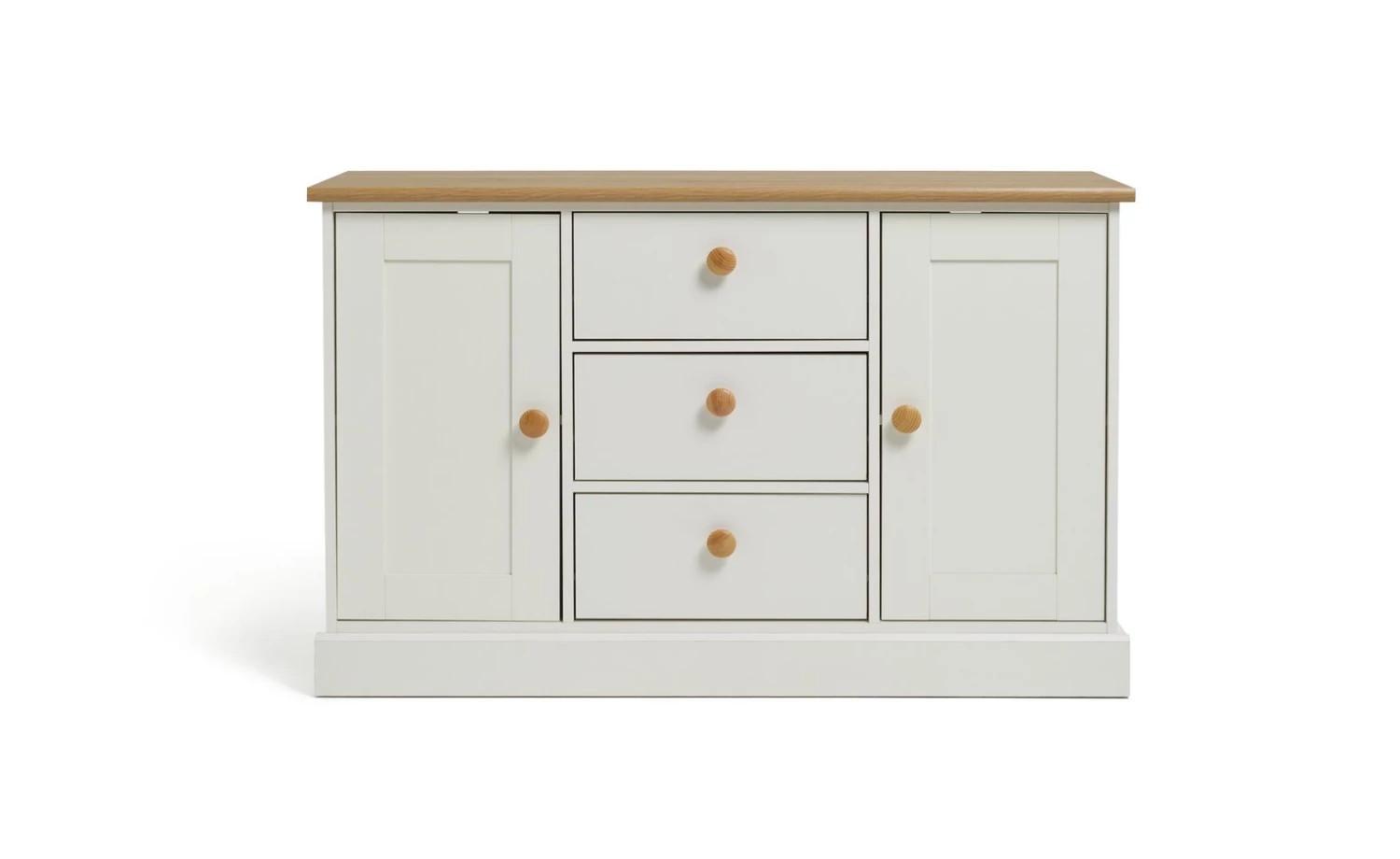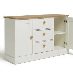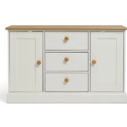 That French farmhouse look nailed. The Habitat Winchester is perfect for relaxed interiors. Its contrasting combination of soft white and oak-effect makes a timeless impression. The thick profiled top, traditional bottom plinth and round nobs bring not only visual appeal, but a laid-back charm to your living space.