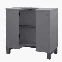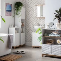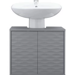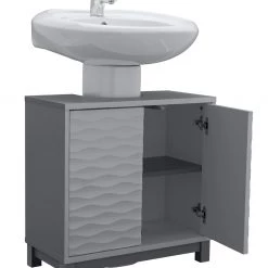 Designer waves for your bathroom. With its ripple-effect texture, this is one good looking under sink unit. It'll add a brightdash of design to your space while hiding clutter. Wrapping around your pedestal sink, Zander has a push-to-open 2-door cabinet. Inside, the adjustable shelf means you can store bottles and cosmetics of varying sizes. How handy.
