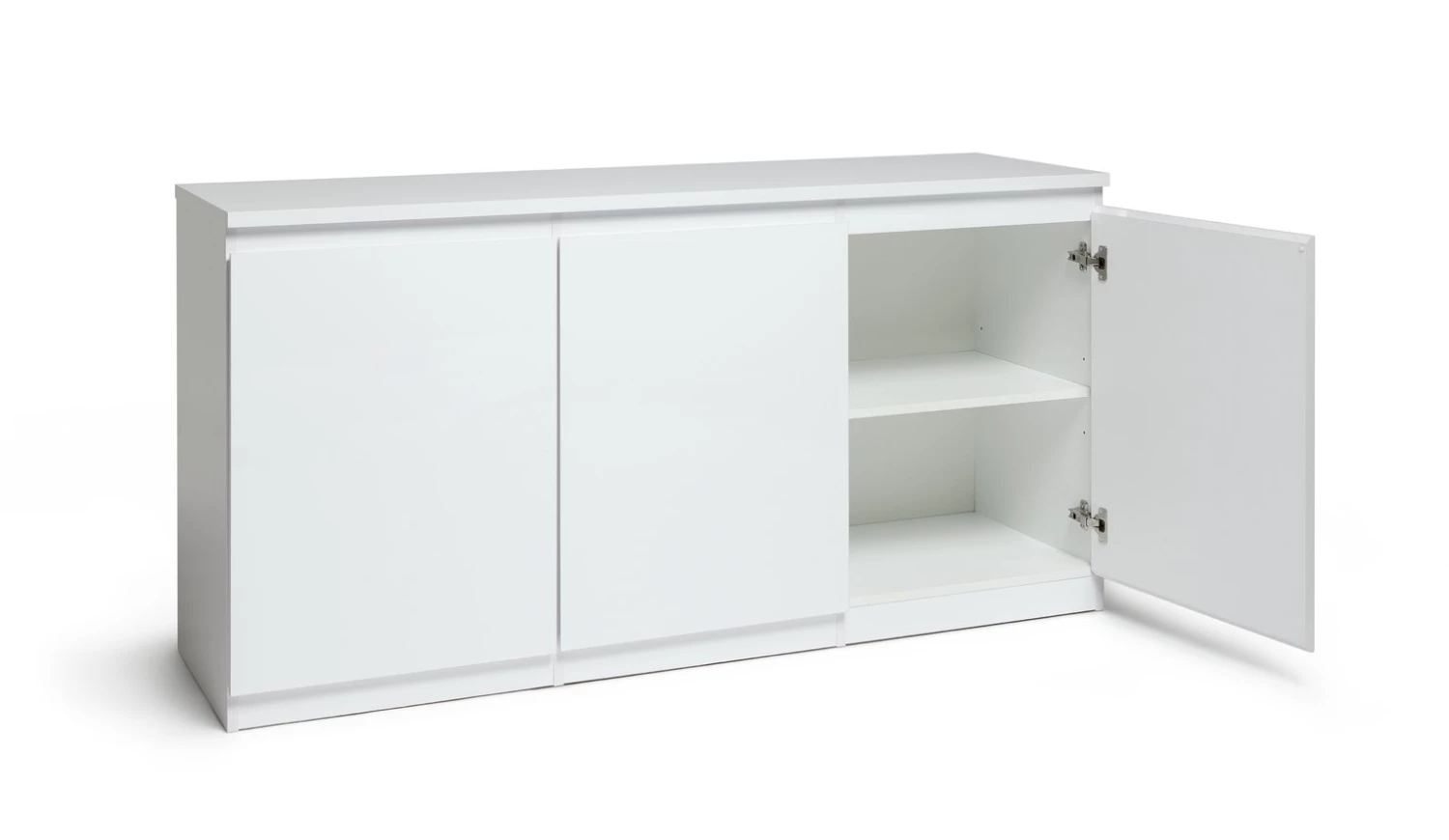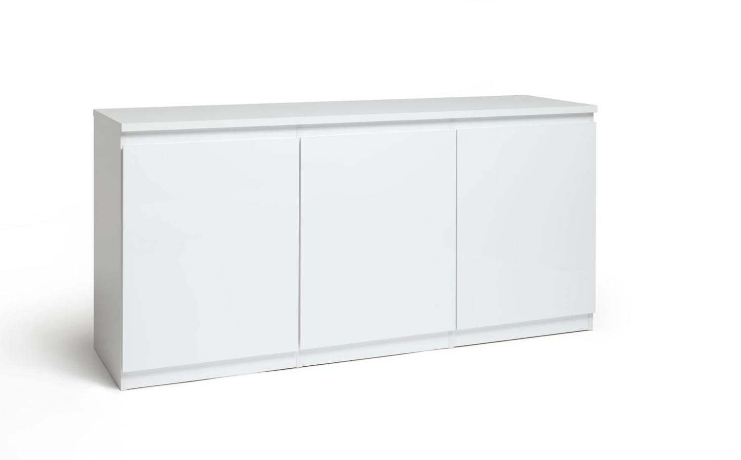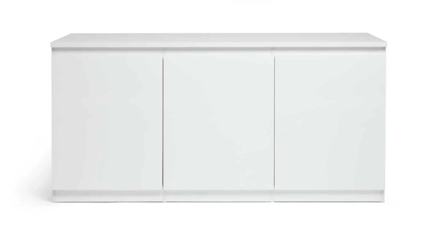 A simple, streamlined design. With a white gloss finish, this is a sideboard with universal appeal. Perfect in your dining room, living room or bedroom, it'll help keep any room blissfully clutter-free. 3 smooth handleless doors open to reveal roomy cupboard space with adjustable interior shelving. It's a great no-nonsense contemporary space-saver. Smart.