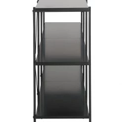 Let's tidy up. Our black industrial shelving unit with 3 long, wooden shelves has a place for everything. Magazines, games, tools, you name it. Whether storing files in a home office or displaying drinks in the dining room, our minimalist unit fits right in with modern decor. Supported by a strong, metal X-frame, it holds up to 25kg. Spacious storage, sorted.