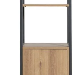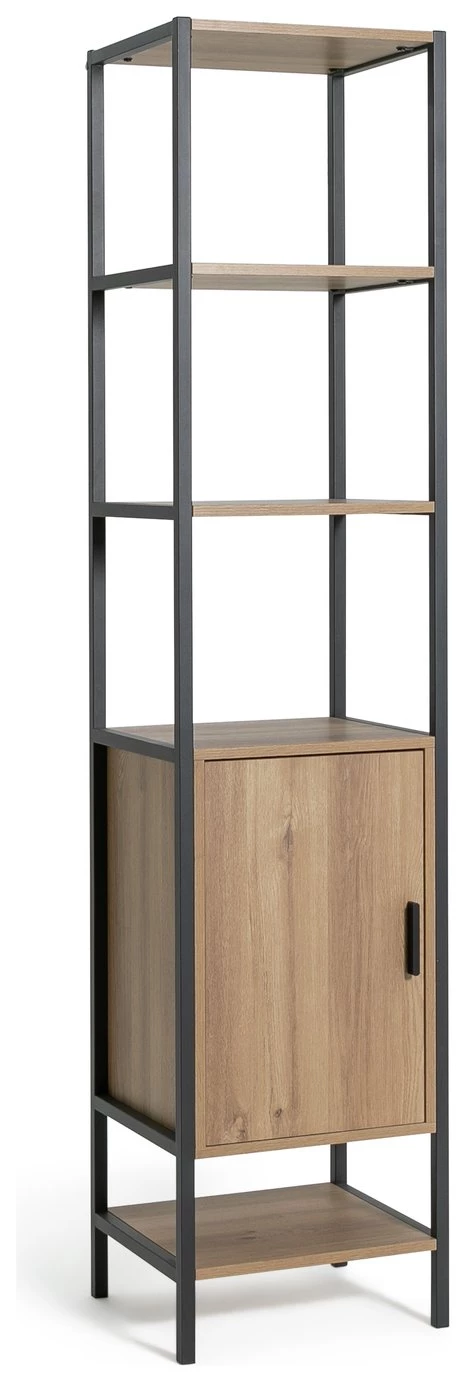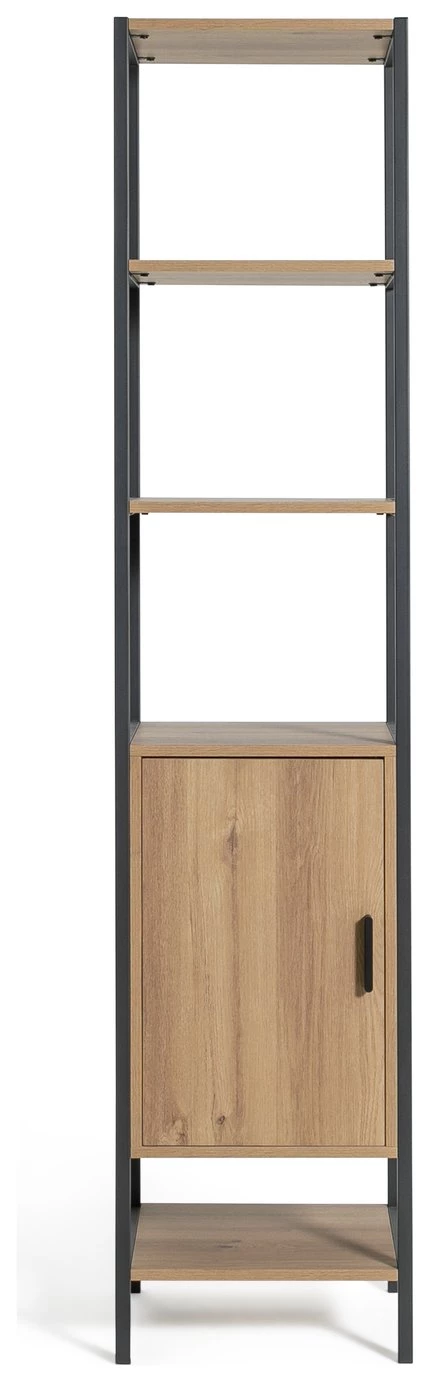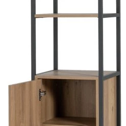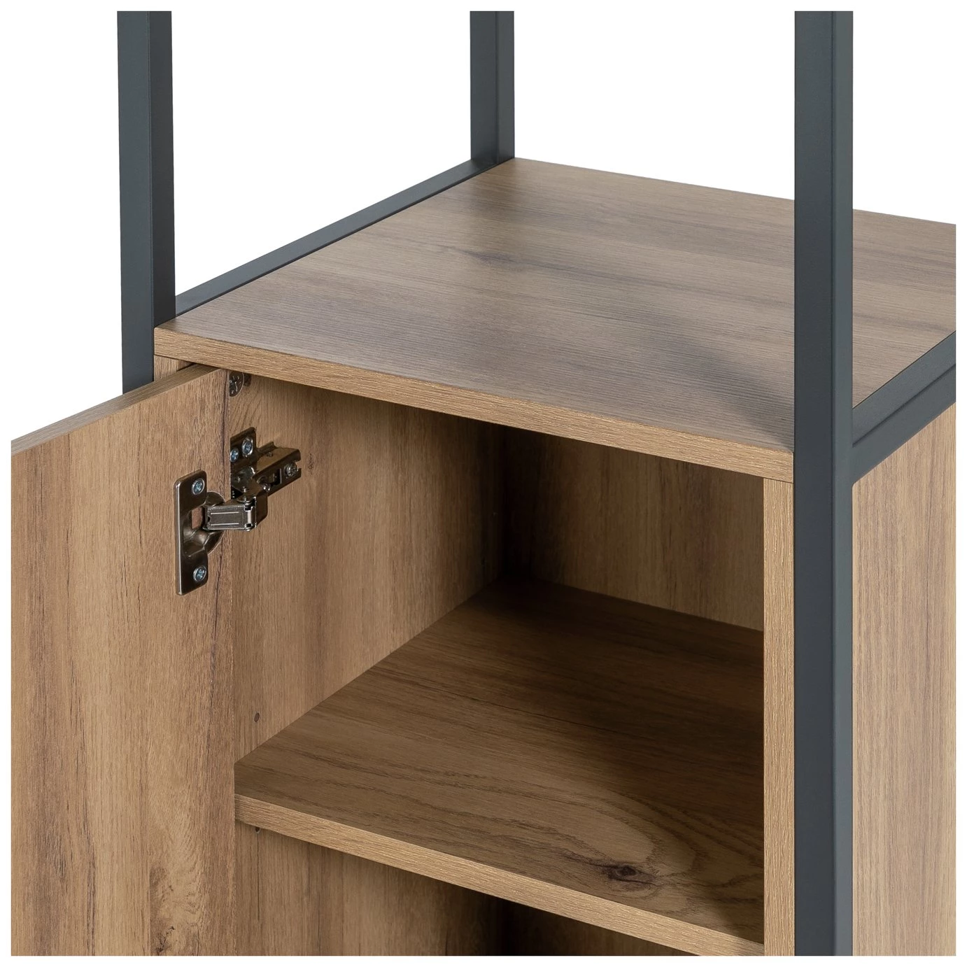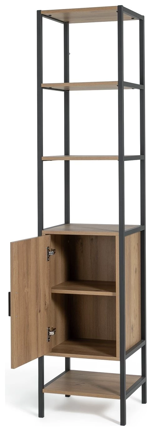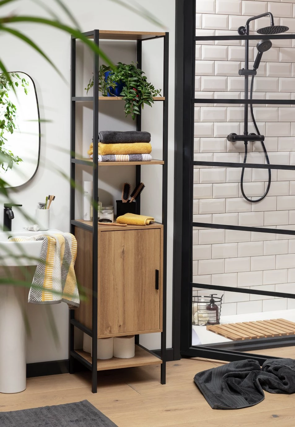 Hello you big strong tall boy. Bring a splash of industrial style to your bathroom with our tallboy freestanding cabinet. Crafted from powder coated steel and warm oak-effect wood. Need lots of space for lotions, creams and products? Just open the cupboard. And the central shelf can be adjusted to fit taller items and knick knacks. That's handy. Pop towels on the open ledges for that finishing touch. Naturally tidy, dramatically edgy.