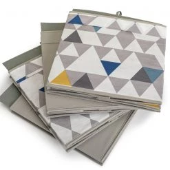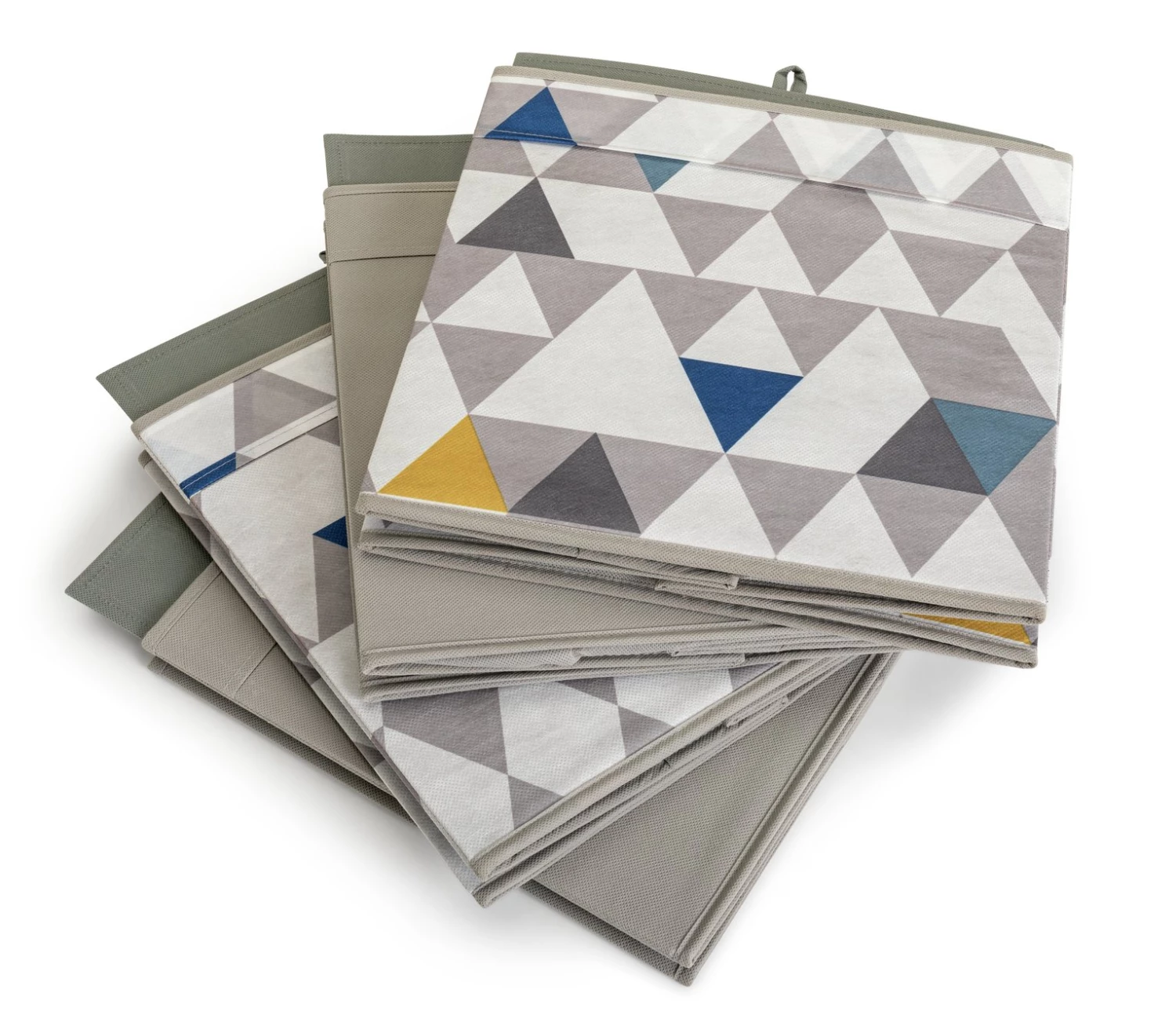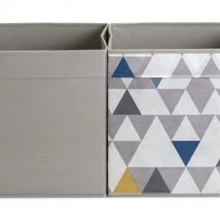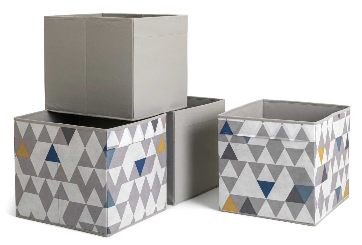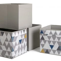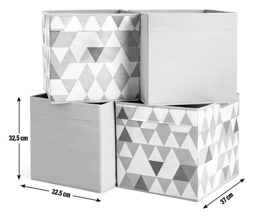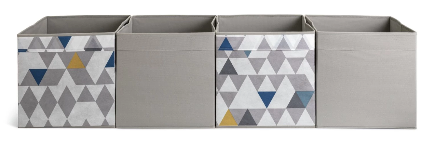 Neaten up with our set of 4 square storage boxes. In funky geo patterns and cool grey tones, they'll bring a modern touch to the bedroom or living room. Tuck toys, games or magazines inside to keep the lounge tidy. Shoes, scarves and gloves? Pop this practical set on a shelf or on top of the wardrobe. Fully collapsible, so you can fold them down when not in use. Striking, smart and sorted.