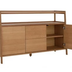 Clean up that clutter with our smart and simple sideboard. A clean, handle-free finish gives this traditional, tapered design a contemporary edge. Fill these 2 spacious drawers and cabinets with anything from games to dinnerware to blankets. A pair of adjustable internal shelves help you fit in plenty. On top, books, plants, pots or prints can be shown off nicely on fixed display shelves. Tidy home, tidy mind.