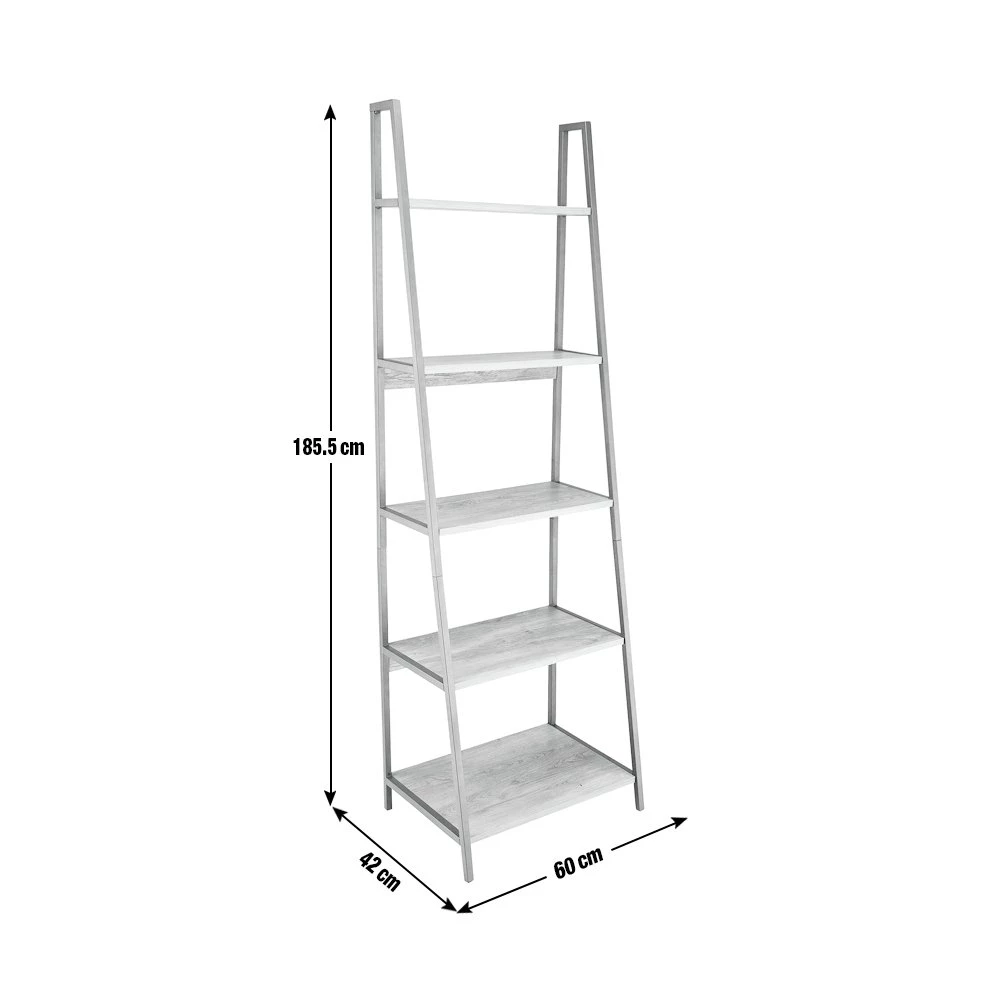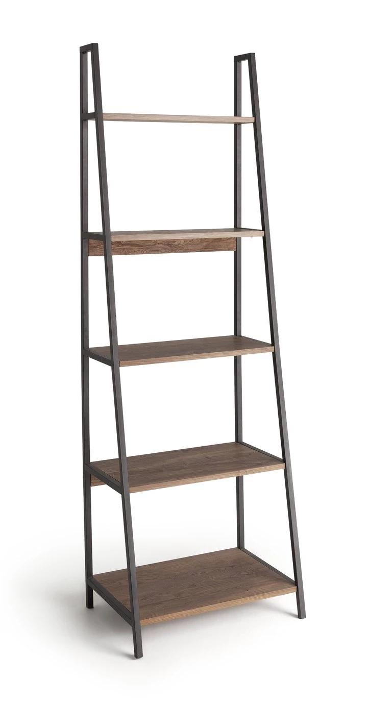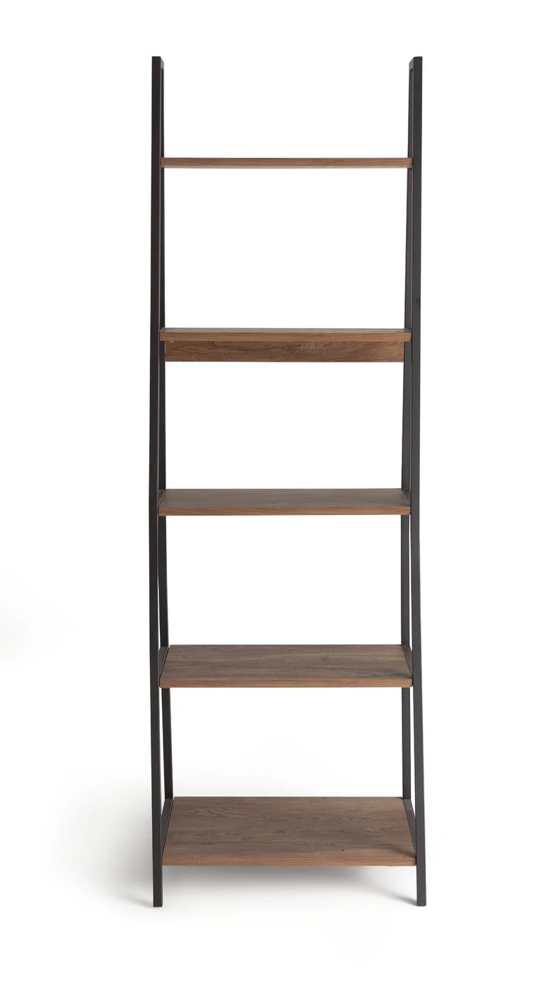 Tap into industrial chic. The Habitat Nomad leaning shelf's mix of metal framework and rich wood-effect finish stuns. Get your living space in order. There are 5 shelves on this open and airy design. They offer the perfect spot to show off your favourite trinkets or books. Effortlessly cool.