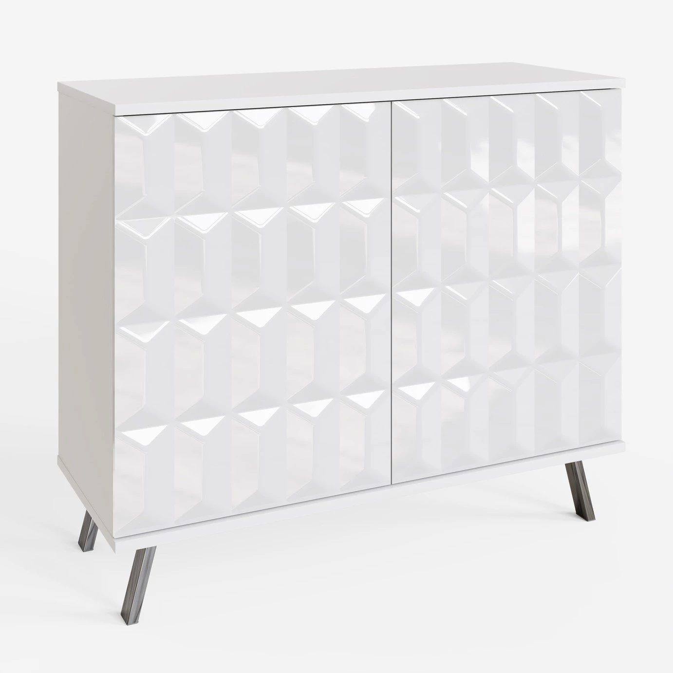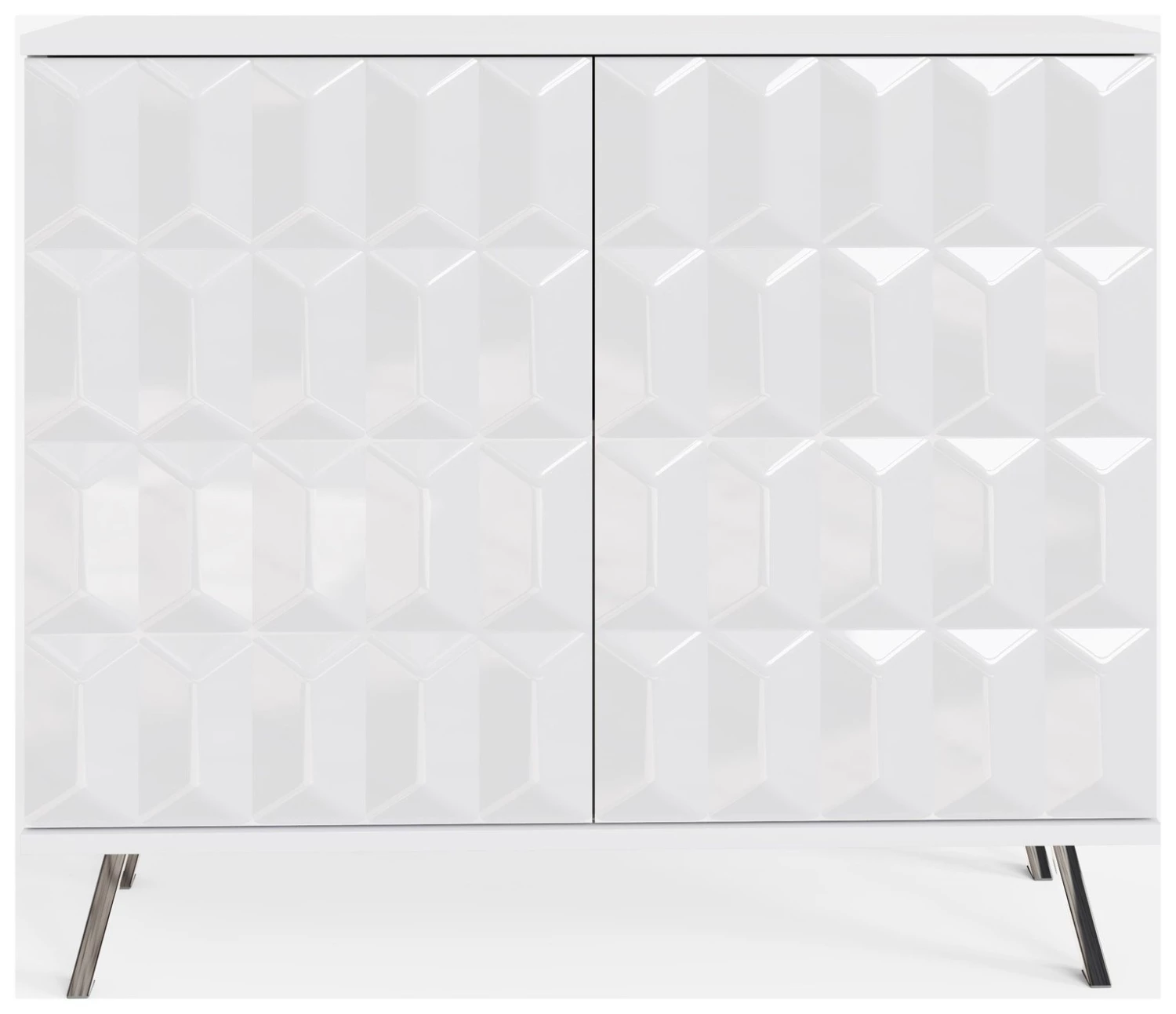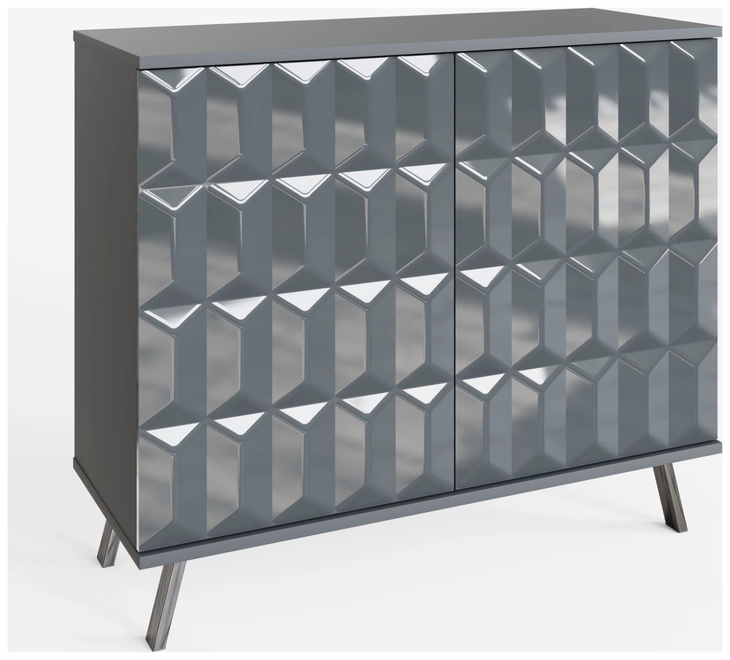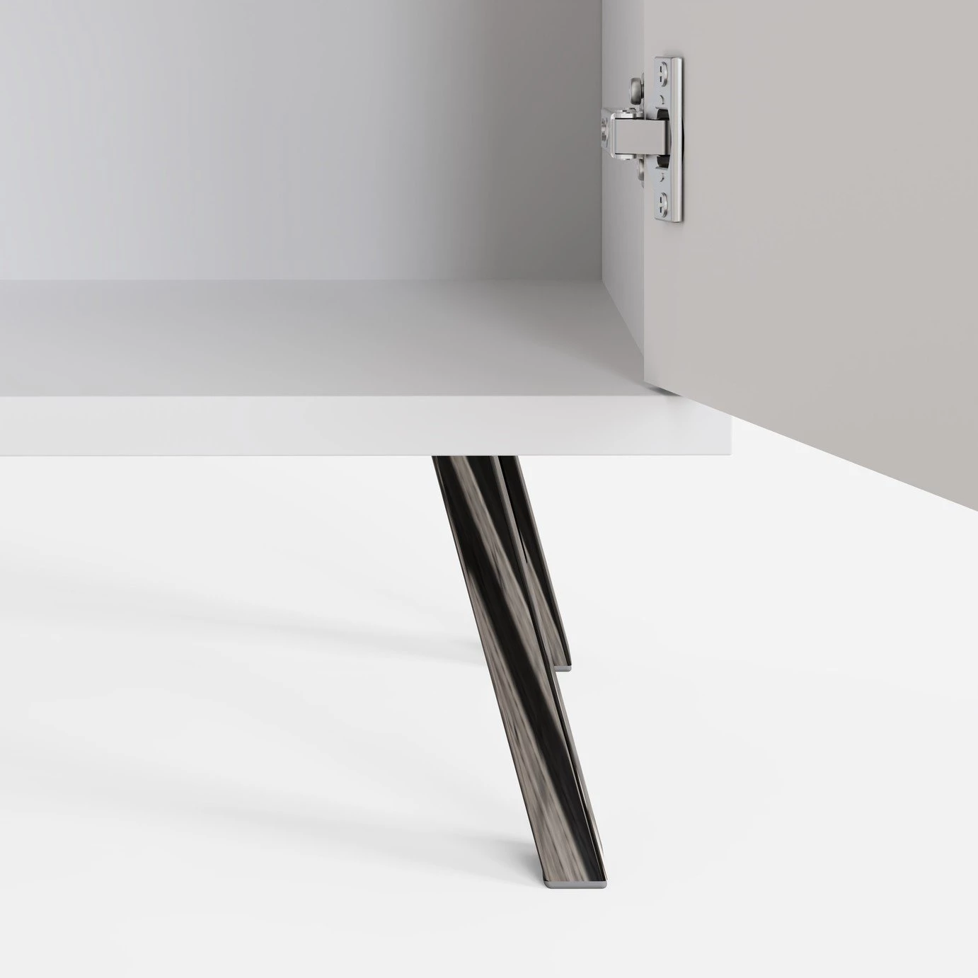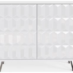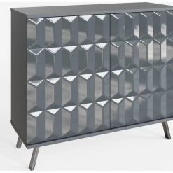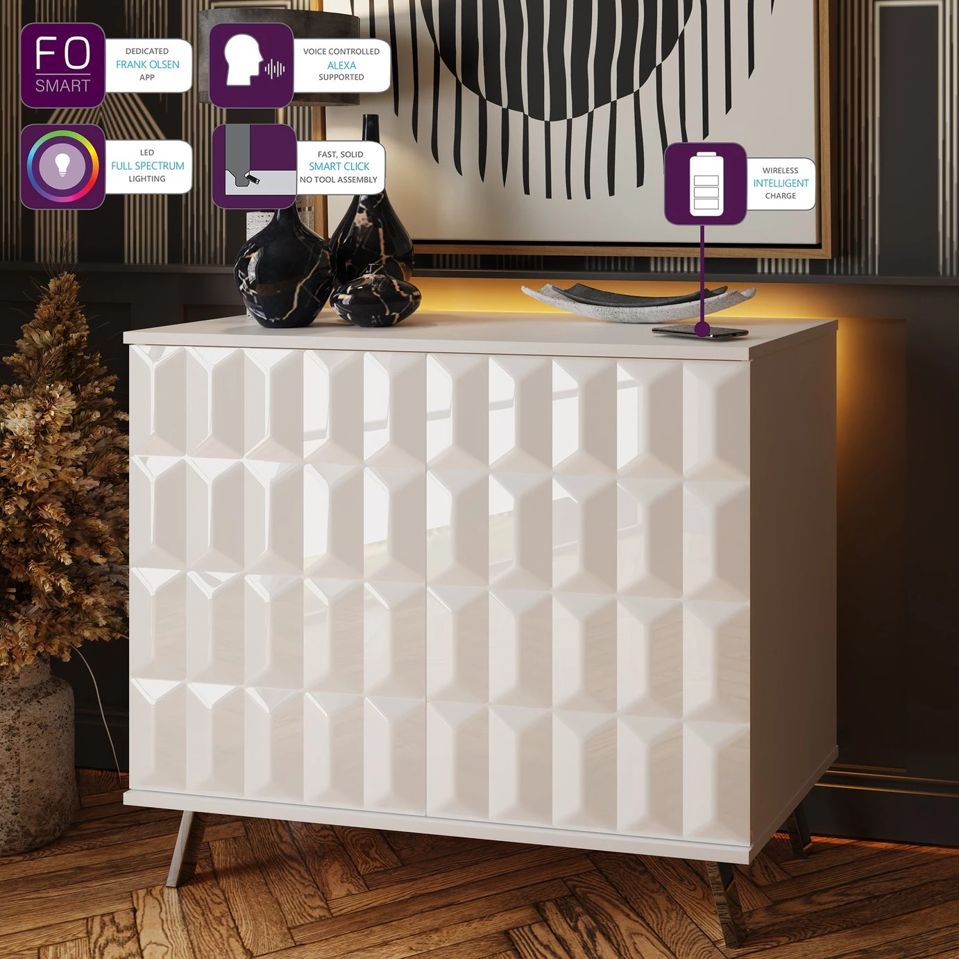 This stylish compact sideboard seamlessly integrates contemporary design with SMART technology features; discreet wireless phone charging and Frank Olsen app or SMART speaker controlled full colour spectrum LED lighting. The Elevate small sideboard with high-gloss painted doors, boasting a striking geometric design and a satin finish main body, brings a sleek contemporary style. Perfect for stylish storage in smaller spaces. The sideboard rests on high-shine smoke chrome legs to complete the look and give added height.