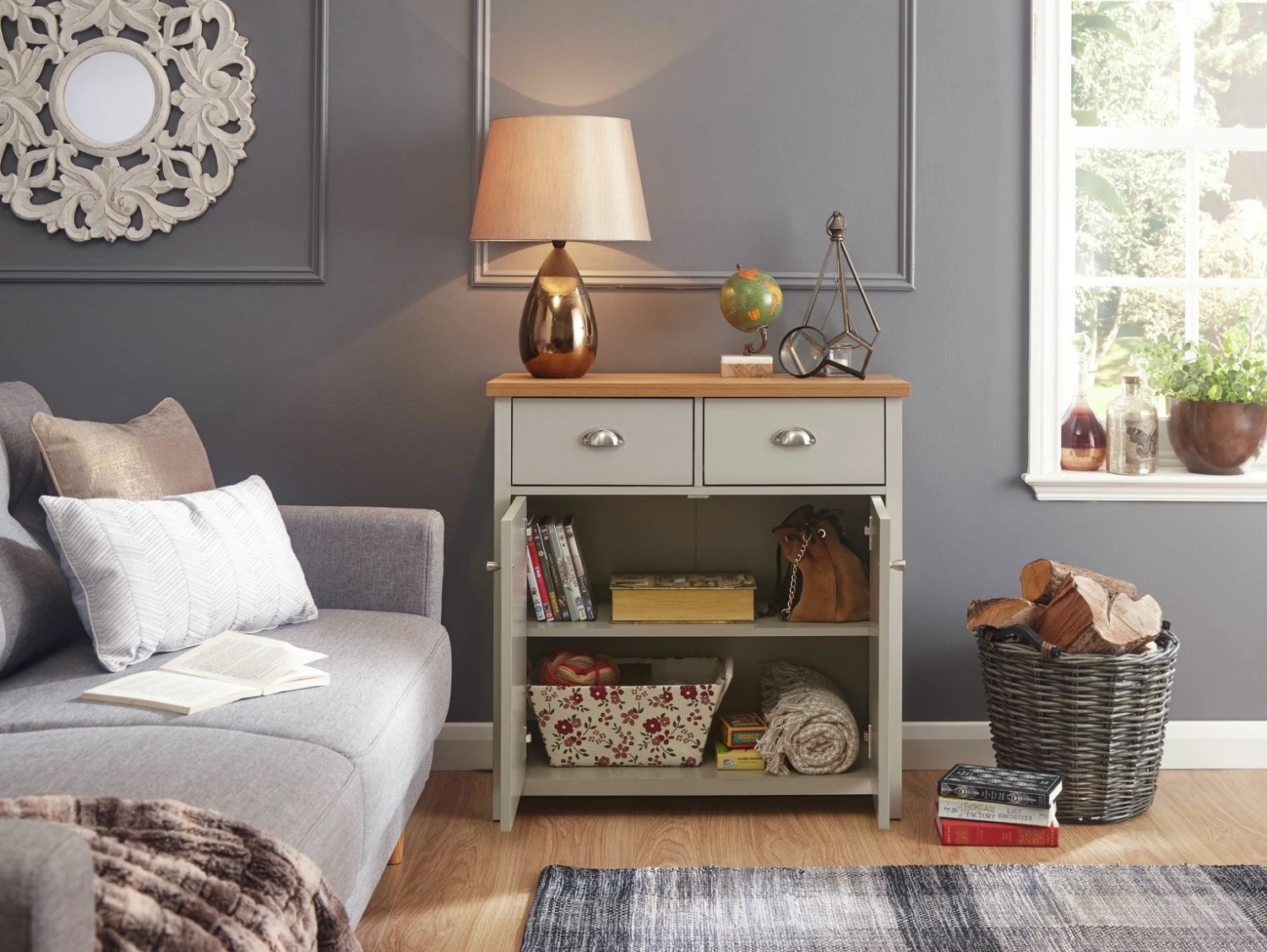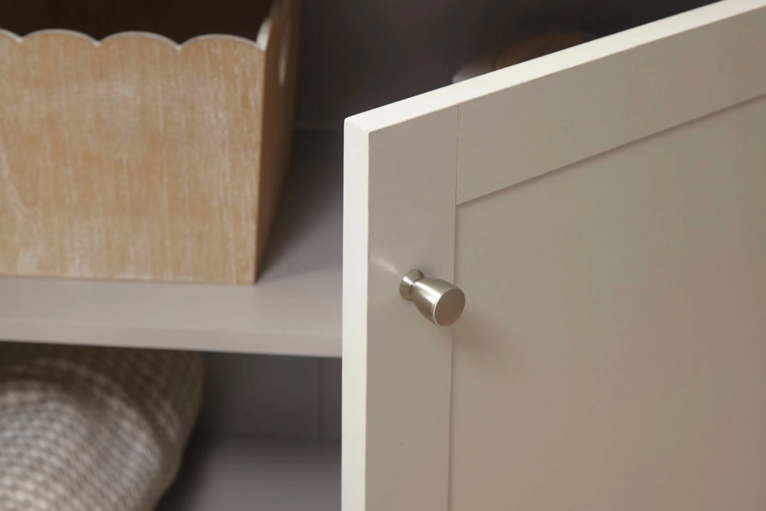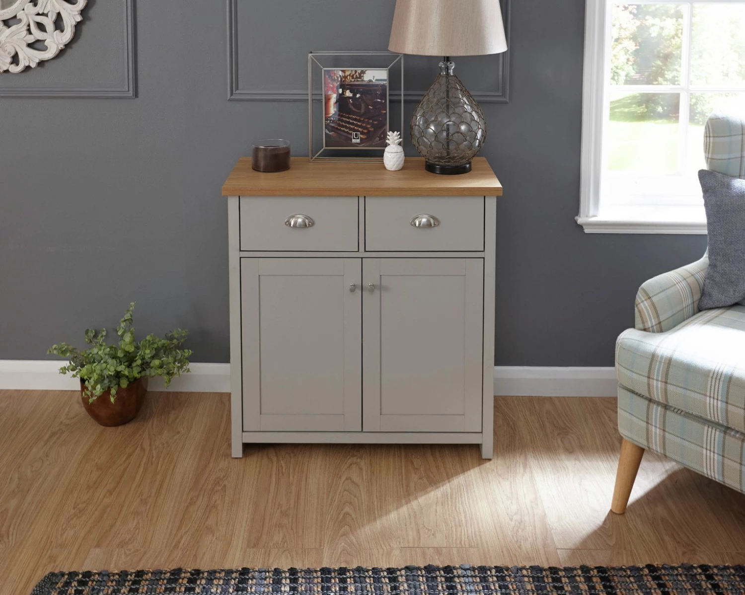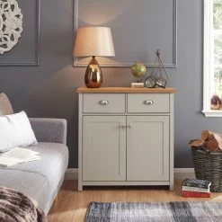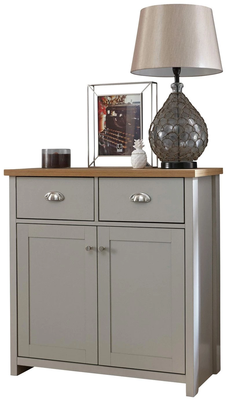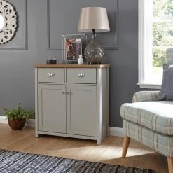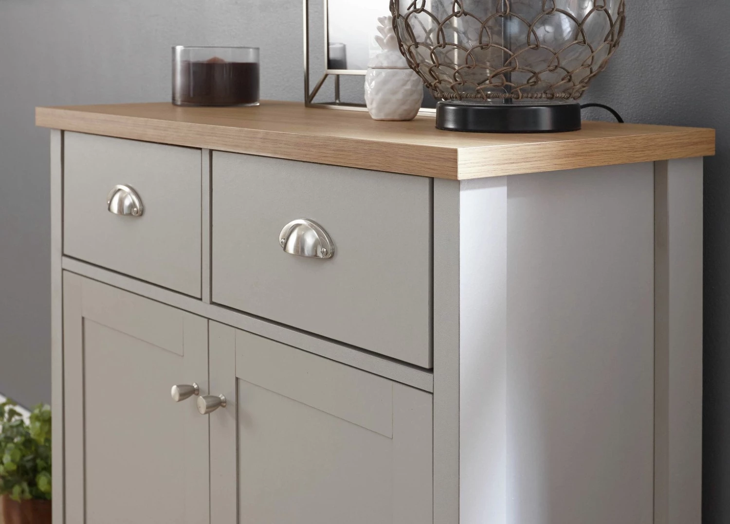 The Lancaster Compact Sideboard is an elegant storage solution for the living or dining room. Featuring a veneered top that matches perfectly with the rest of the Lancaster range and features two handy drawers with satin silver handles and a spacious triple door cupboard underneath fitted with satin silver knobs.