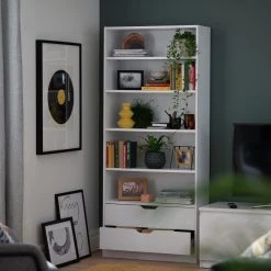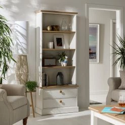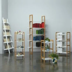 Perfect for smaller spaces, this versatile narrow leaning bookcase provides storage and display space for books and decorative objects. Jessie has clean, crisp lines in walnut veneer with solid uprights and a durable, lacquered finish, and attaches to the wall for safety.