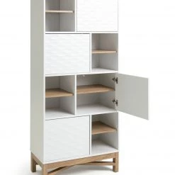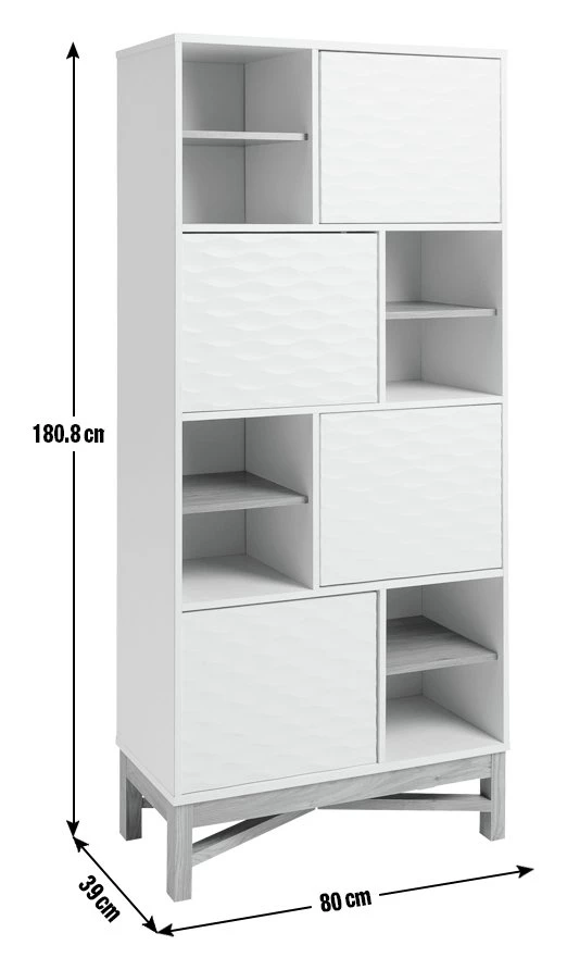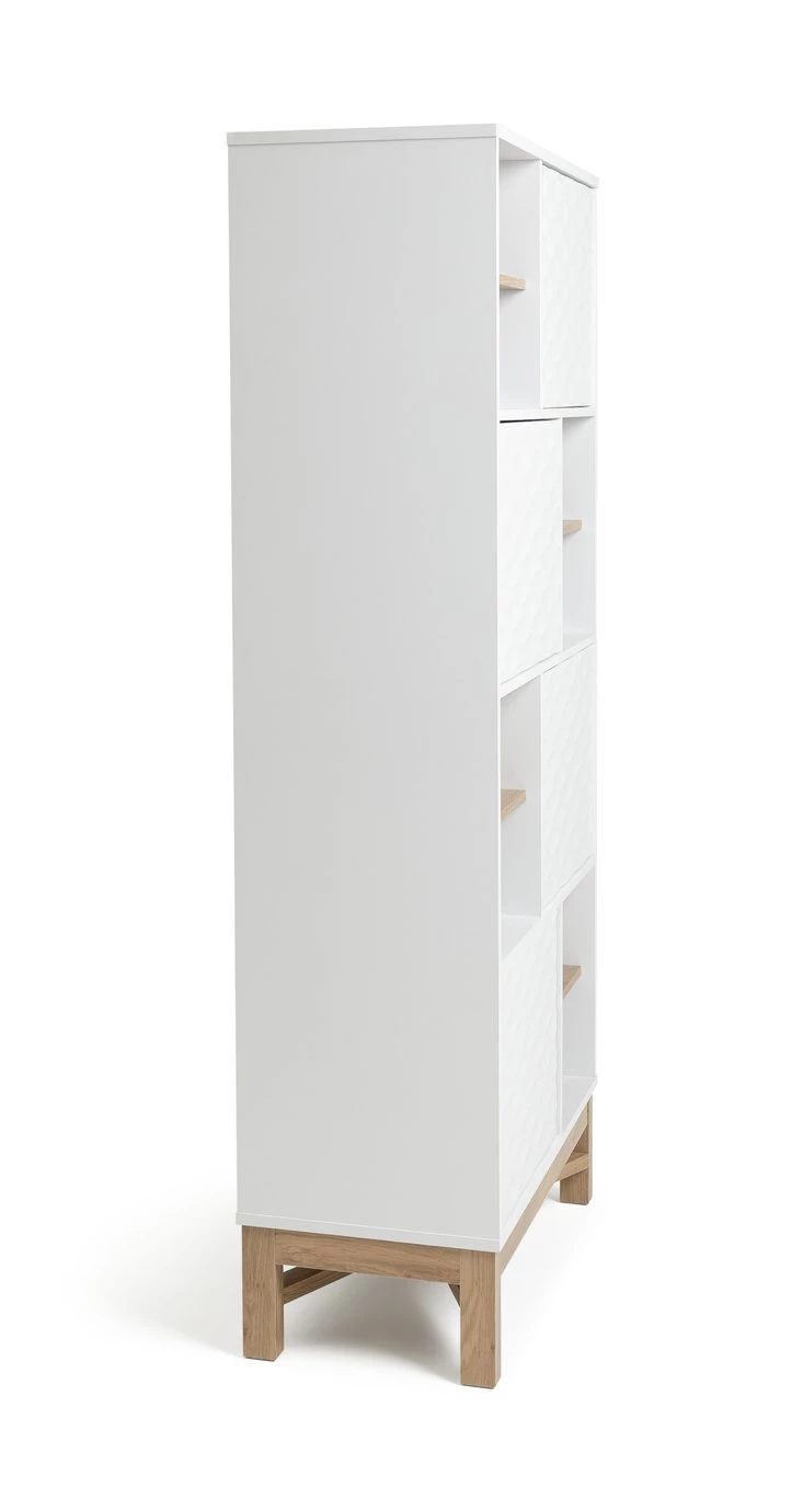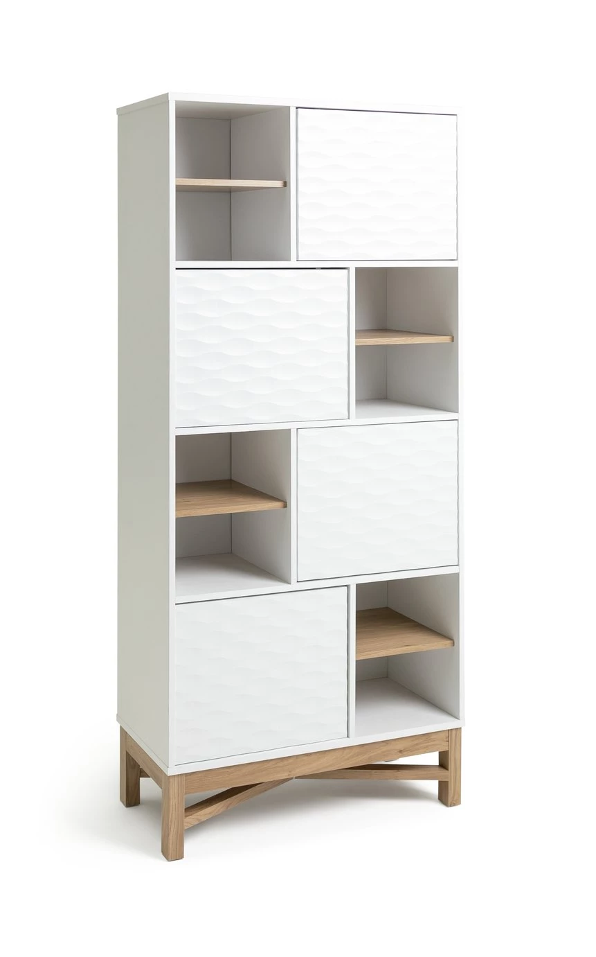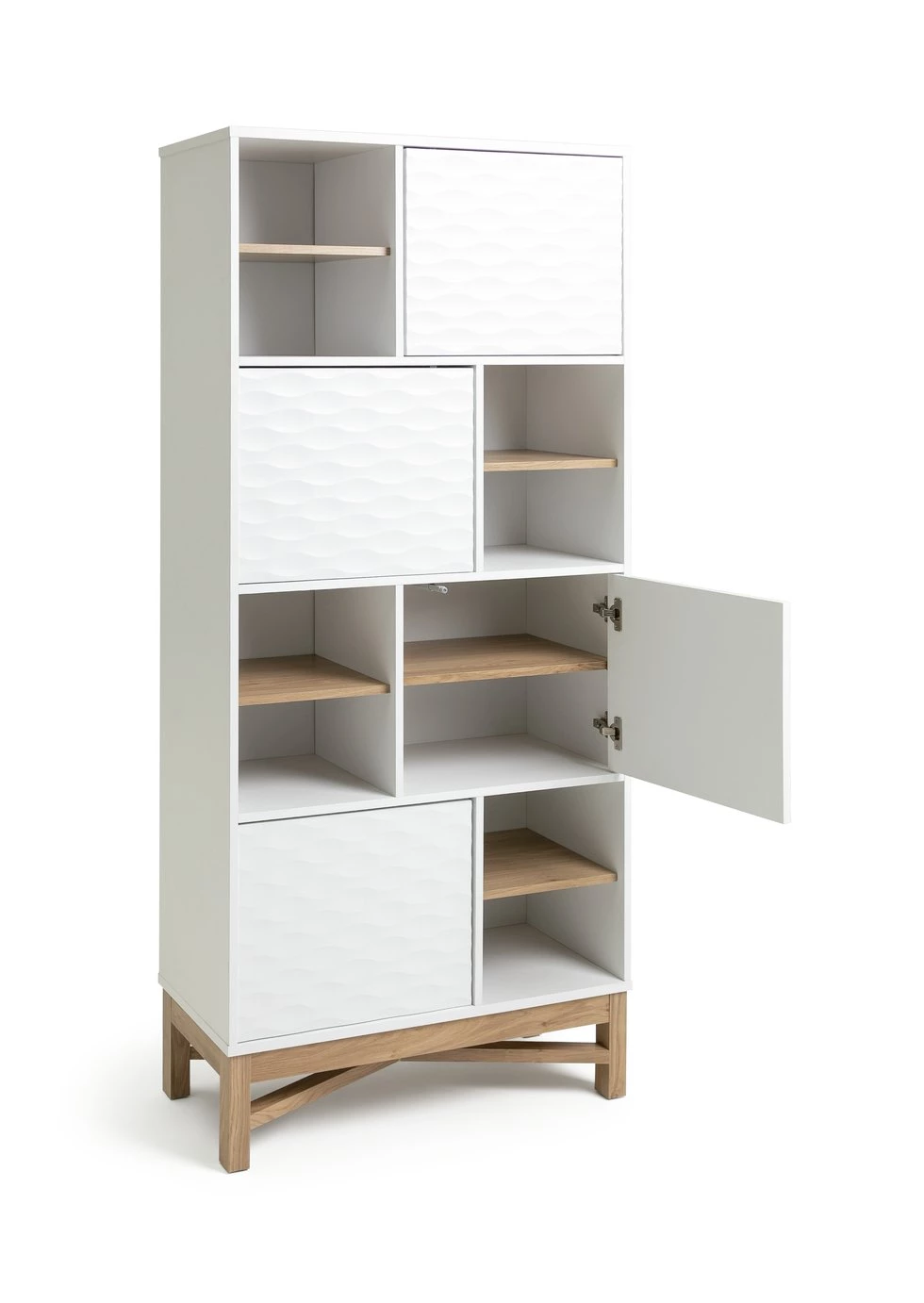 Contemporary design at its best, the Zander 4-tier shelving unit is a stylish and practical addition to any room. Storing everything from books to records with ease, this wide unit has a mixture of open shelves and closed cupboards. The ripple textured white finish, oak detailing and cross trestle-style legs give off that soft Scandi look we can't get enough of.